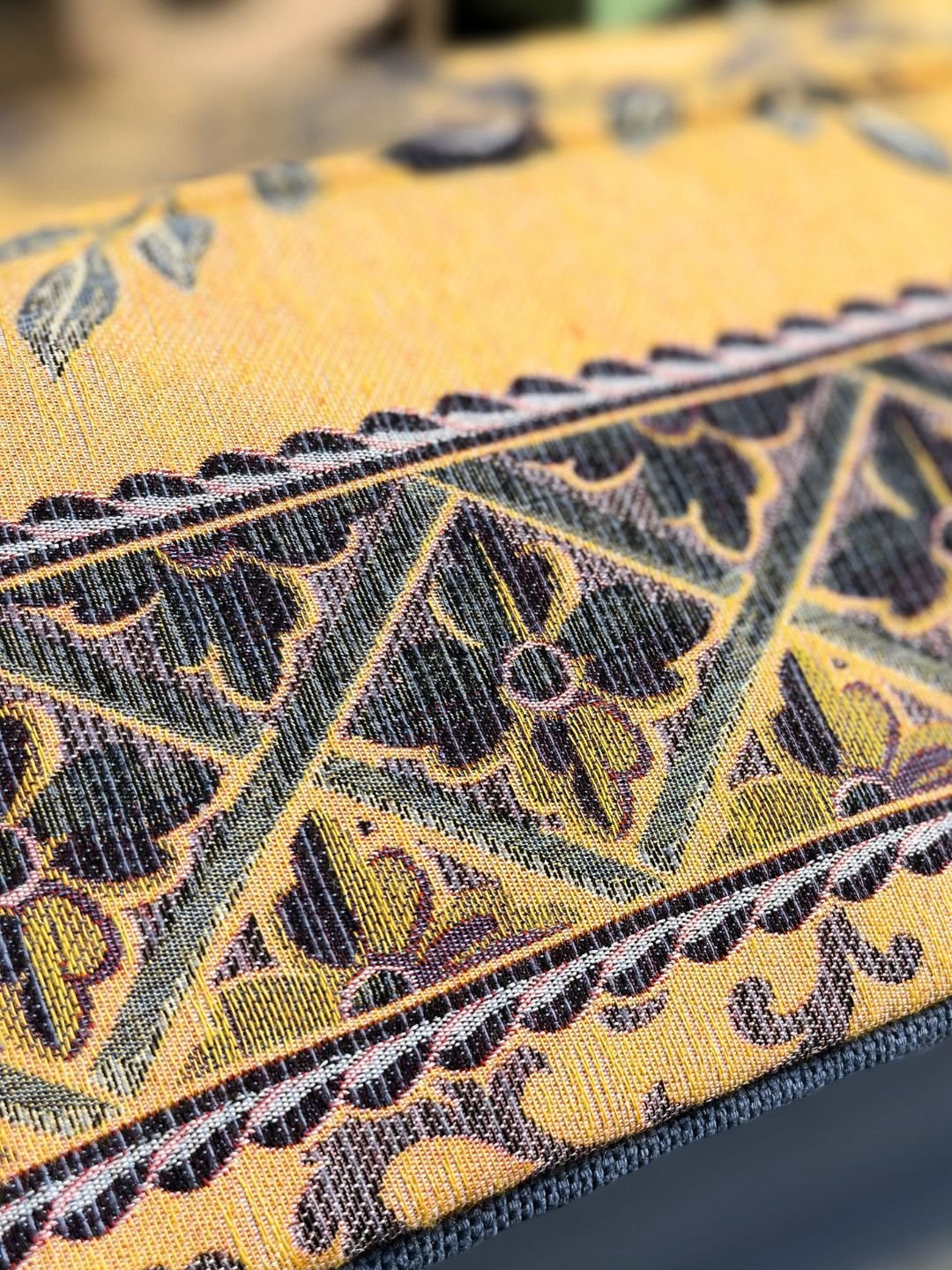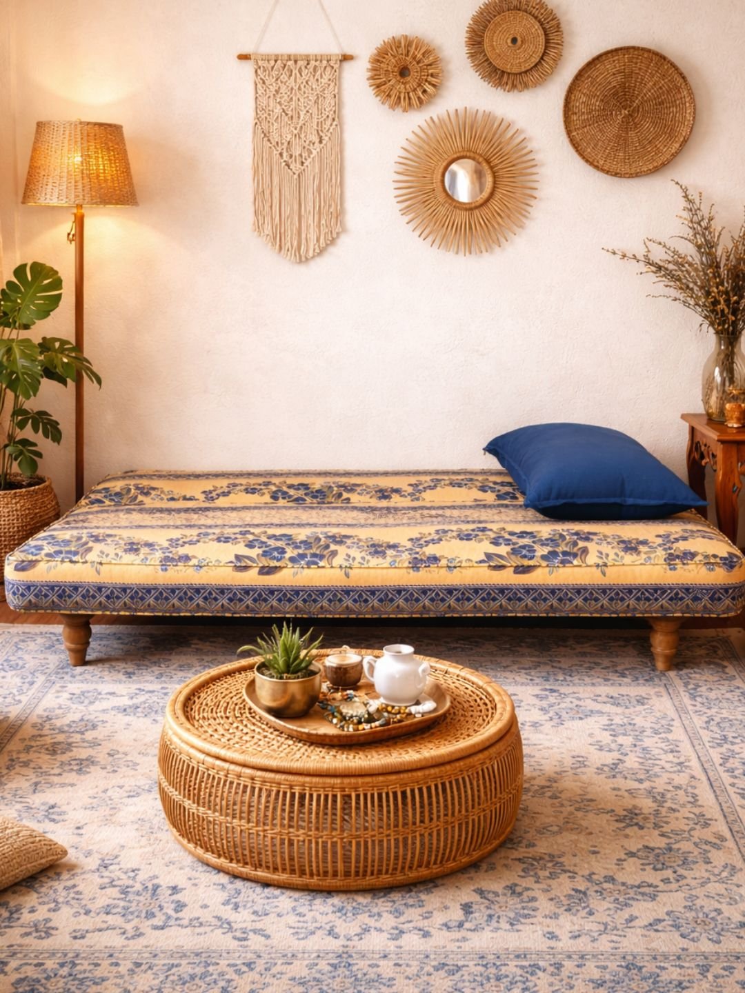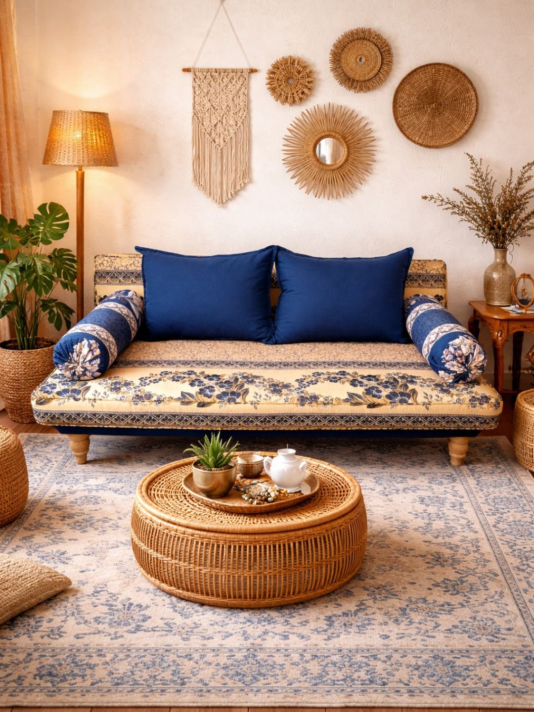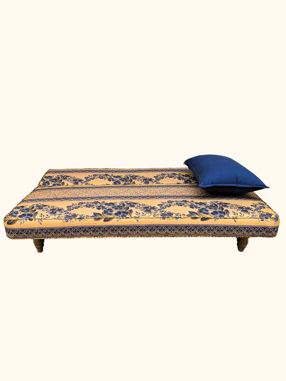 Αυτός ο καναπές-κρεβάτι συνδυάζει πρακτικότητα και πολυτέλεια με τον μποχο oriental σχεδιασμό του. Κατασκευασμένος από ξύλο μασίφ για αντοχή και σταθερότητα, διαθέτει πλούσιο υφασμάτινο σχέδιο με βάση χρυσοκίτρινου χρώματος και μπλε λεπτομέρειες, προσθέτοντας μια αυθεντική αραβική πινελιά.