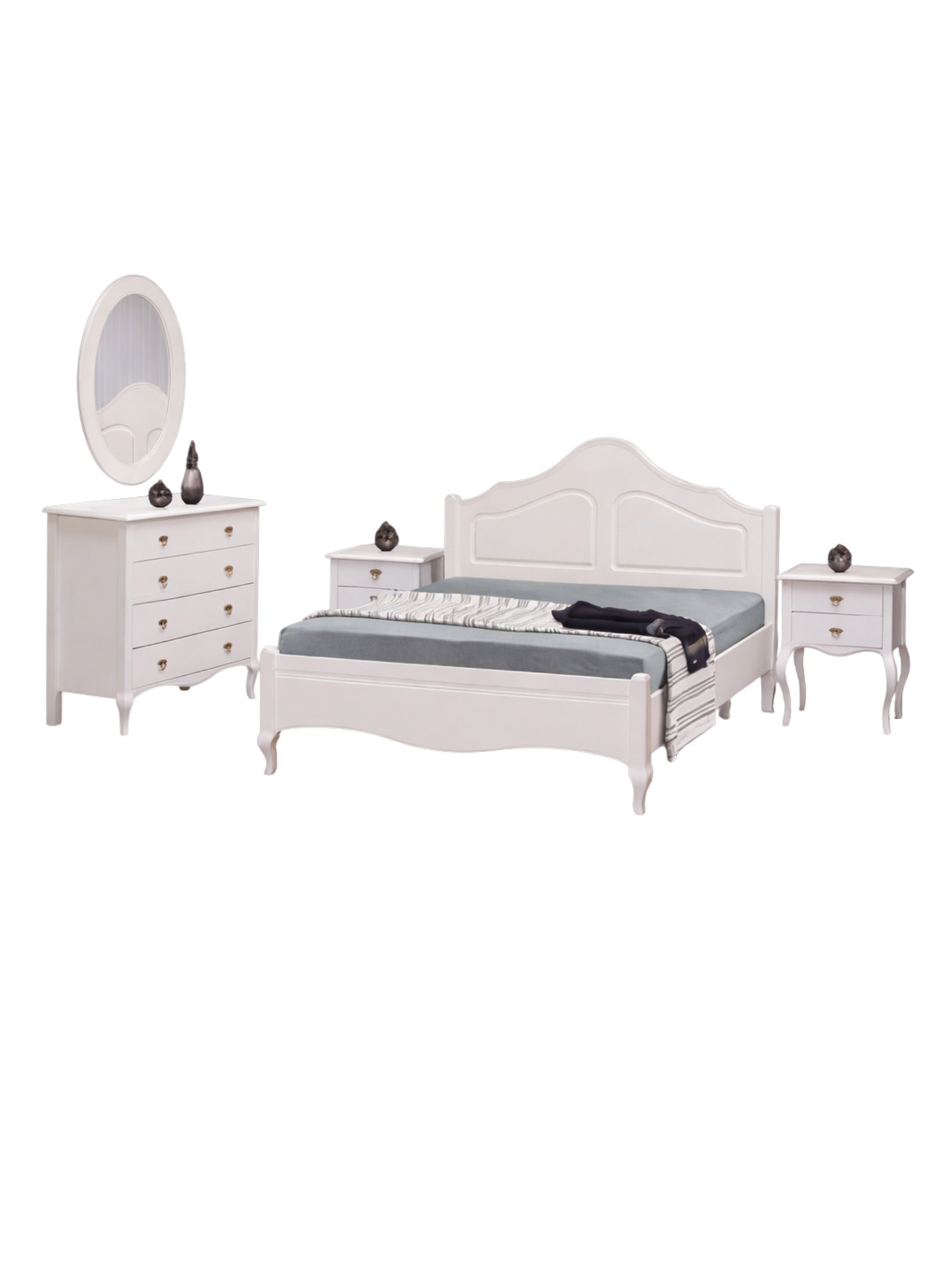 Ξύλινο σετ κρεβατοκάμαρας σε κλασικό ρομαντικό στυλ, βαμμένο σε καθαρό λευκό χρώμα με καμπυλωτές γραμμές και λεπτομέρειες σε χρυσές λαβές.